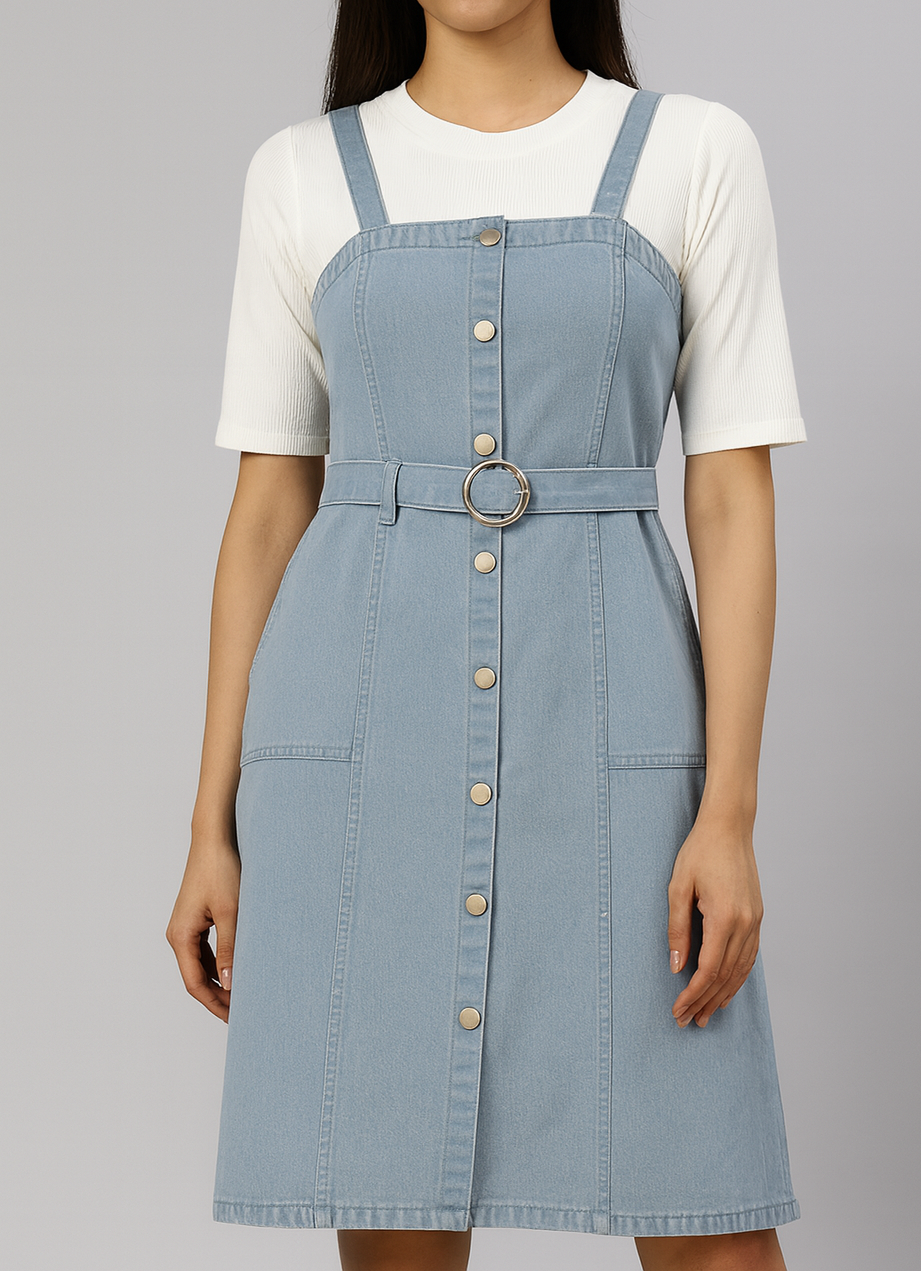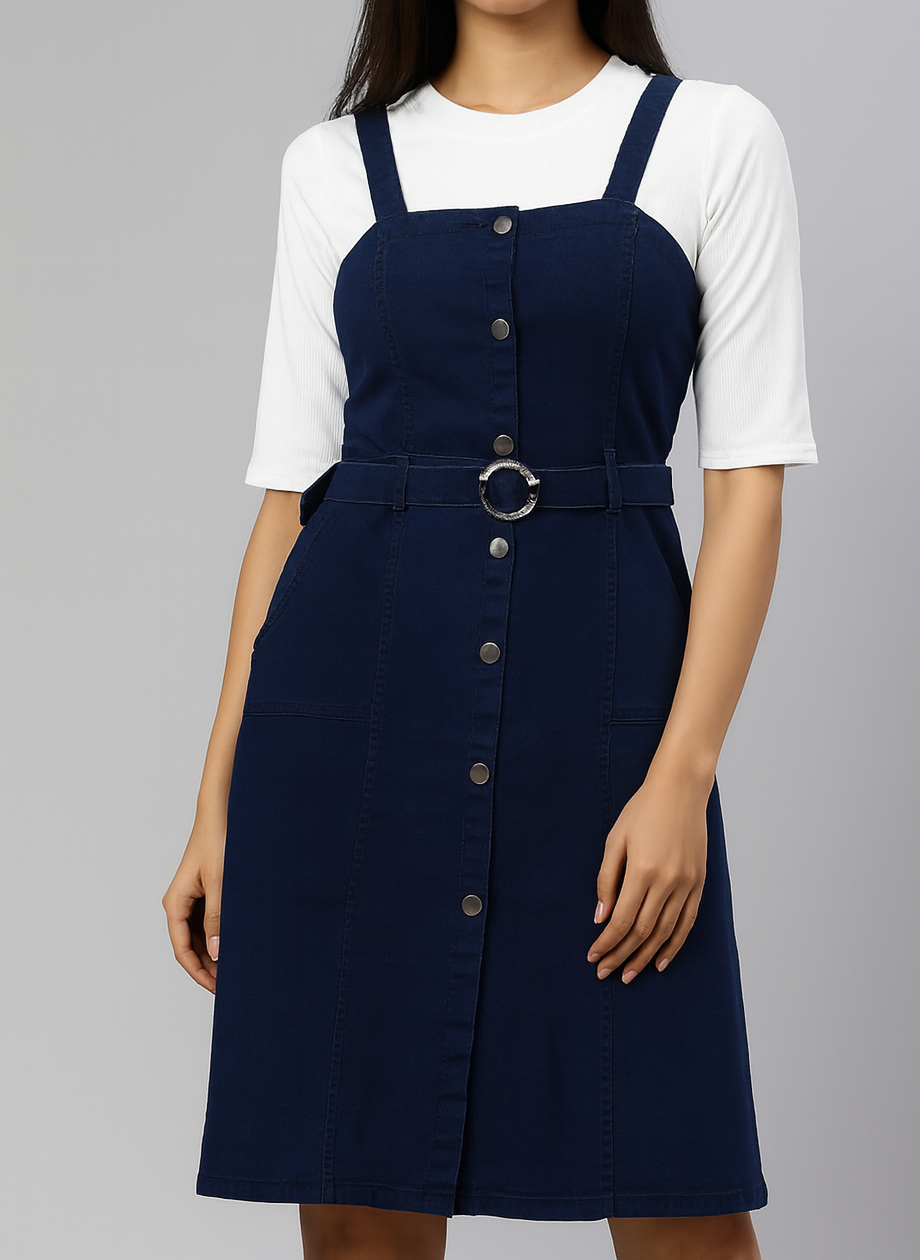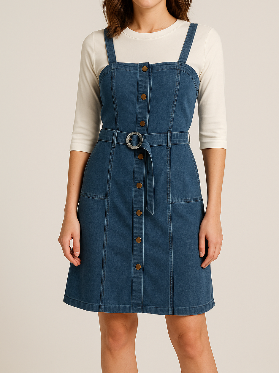 - STYLE: Classic denim overall middy dress featuring button-front closure and adjustable shoulder straps for a customised fit