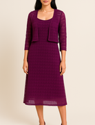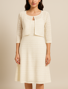 This Middy dress is complemented by a perfectly coordinated cropped jacket with three-quarter length sleeves and an elegant front opening. The scoop neckline and knee-length cut of the dress strike the perfect balance between style and workplace appropriateness. This versatile set transitions seamlessly from office meetings to evening occasions. The lace texture adds a feminine touch while maintaining a professional appearance. The fitted silhouette creates a polished look, while the layered design offers styling flexibility - wear them together for a coordinated outfit or separately to create different looks. Perfect for daily office wear, this set combines comfort with sophistication. The timeless design ensures this piece will remain a wardrobe staple for seasons to come.